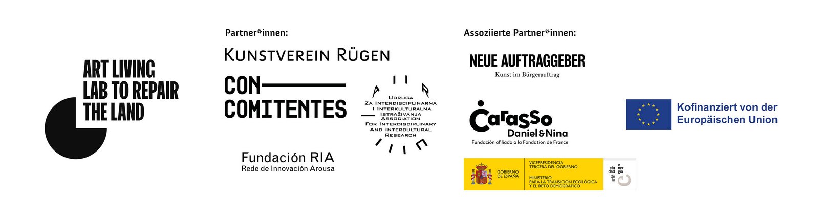 Art Living Lab to Repair the Land wird aus Mitteln des Programms Kreatives Europa der Europäischen Union ko-finanziert, sowie unterstützt vom Ministerium für Wissenschaft, Kultur, Bundes- und Europaangelegenheiten Mecklenburg-Vorpommern, der Daniel and Nina Carasso Stiftung (Spanien), dem Ministerium für Kultur und Medien der Republik Kroatien sowie der Stadt Zagreb/Büro für Kultur und Zivilgesellschaft (Kroatien). Art Living Lab to Repair the Land wird koordiniert von Concomitentes (Spanien) und gemeinsam entwickelt mit Association for Interdisciplinary & Intercultural Research (Kroatien), Kunstverein Rügen e.V. (Deutschland) und RIA Foundation (Spanien).